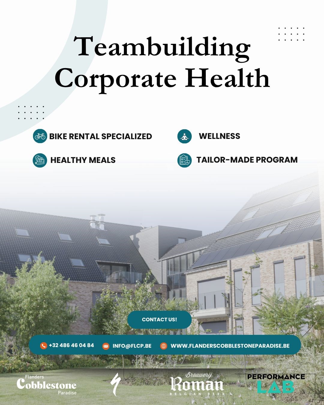 Pour une récupération et un regain d'énergie optimaux lors de vos séances intensives, nous disposons d'une salle de fitness ultramoderne, d'un spa et d'une chambre d'oxygénothérapie hyperbare normobare NBOT/HBOT. Les environs offrent également de magnifiques sentiers de randonnée et de vélo, avec location de vélos électriques, VTT et gravel bikes, parfaits pour le team-building et les loisirs. Avec un grand parking, une cuisine d'équipe et un restaurant sur place, Flanders Cobblestone Paradise est la destination idéale où travail, détente et team-building convergent.